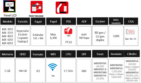 MX-3051/ MX-3551/ MX-4051/ MX-5051/ MX-6051 Sistema COLOR de trabajo grupo mediano 30 / 35/ 40/ 50/ 60 páginas por minuto | |