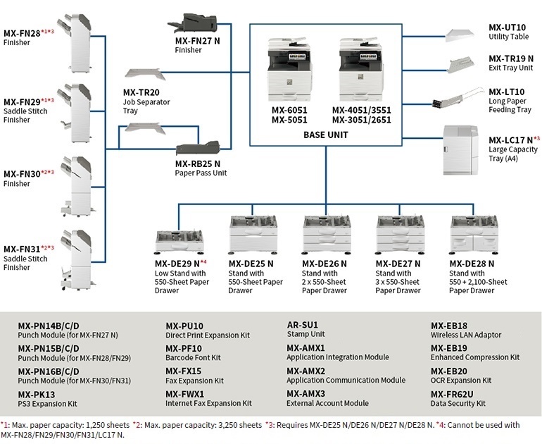 MX-3051/ MX-3551/ MX-4051/ MX-5051/ MX-6051 Sistema COLOR de trabajo grupo mediano 30 / 35/ 40/ 50/ 60 páginas por minuto | |