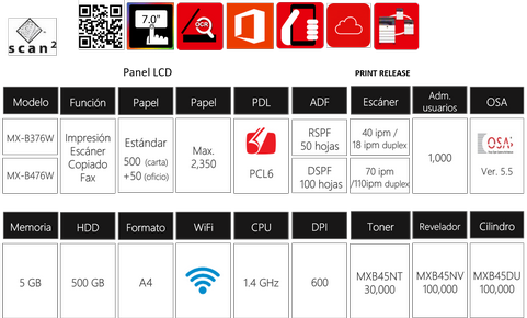 MX-B376W / MX-B476W Sistema de trabajo de grupo pequeño 37 / 47 paginas por minuto | |