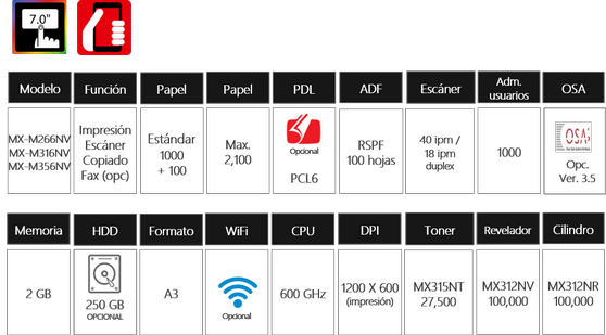 MX-M266/MX-M316/MX-M356 Sistema de trabajo de grupo pequeño 26 /31 /35 paginas por minuto | |