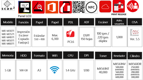 Serie Advanced MX-M5071/MX-M6071 se construyen utilizando la última tecnología disponible para brindar el rendimiento, las características y la confiabilidad que se necesitan en los actuales complejos entornos de trabajo. Estos nuevos dispositivos multifunción también son fáciles de usar y ofrecen una mayor productividad, todo para brindar a los clientes una experiencia perfecta e intuitiva, y la confianza en saber que sus trabajos saldrán bien desde la primera vez, siempre. La nueva serie Advanced monocromática también ofrece funciones de seguridad de vanguardia para ayudar a las empresas a proteger sus datos e información personal. | ![]() |